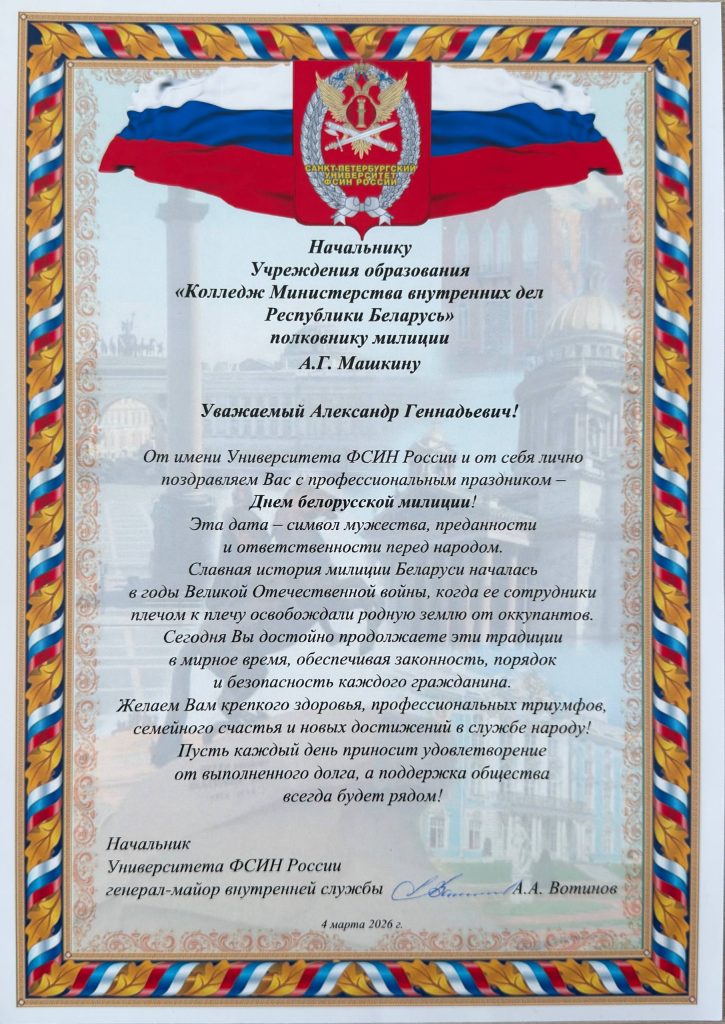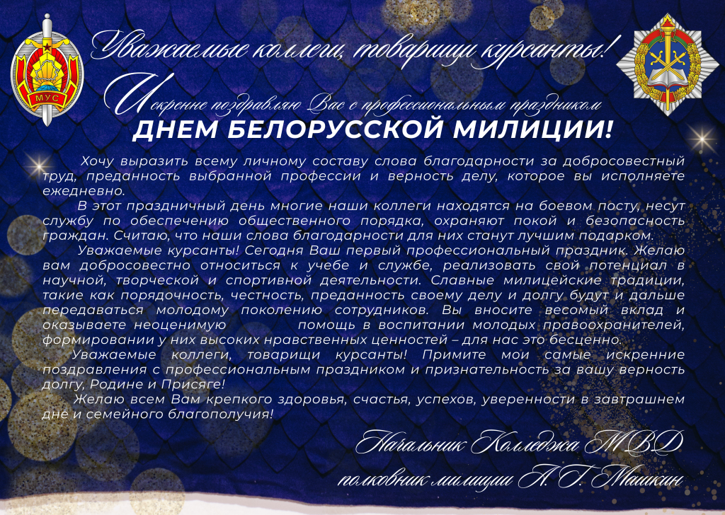 Поздравление Начальника учреждения образования «Колледж Министерства внутренних дел Республики Беларусь». Далее