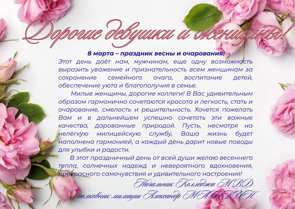 Поздравление Начальника Колледжа МВД с Международным женским днем. Далее